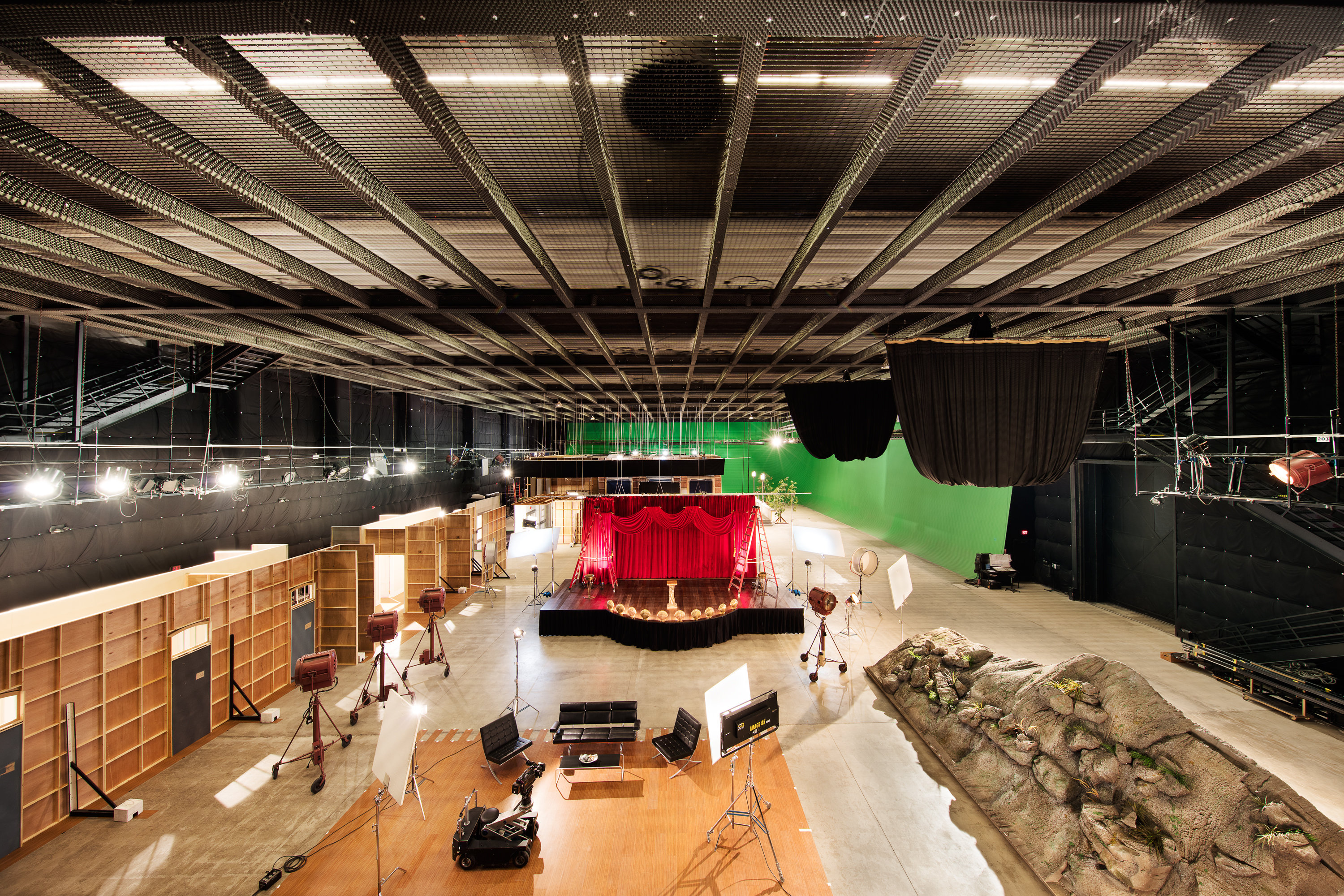 At 20,000 square feet, the free-span sound stage at the Golden Era Productions film studio is one of the largest in North America. Rising 3 stories, it contains one of the largest cyclorama walls in the US and an 8,000-square-foot grid system.